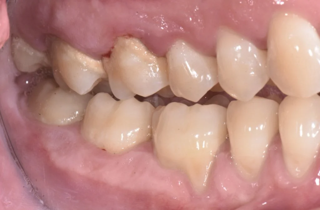 Alain a consulté suite à l’apparition de douleurs et d’abcès avec des dents qui bougent. Sa gencive est douloureuse et il a du mal à brosser. Ses problèmes sont aggravés par une maposition sévère des dents. Celle-ci ne peut être corrigée que par une chirurgie maxillo-faciale sous anesthésie général s’il le désir.
